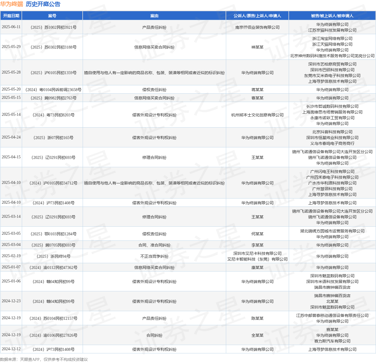 案号:(2025)沪0105民初1359号审理法院:上海市长宁区法院案由:擅自使用与他人有一定影响的商品名称、包装、装潢等相同或者近似的标识纠纷当事人信息: 原告/上诉人:华为终端有限公司 被告/被上诉人:深圳市艺柏意商贸有限公司、深圳市巴硕科技有限公司、东莞市艾米森电子科技有限公司、上海寻梦信息技术有限公司开庭日期:2025年5月28日根据统计,近一年内以华为终端有限公司为当事人的历史开庭公告有59则,其中案由为“买卖合同纠纷”的公告以12则居首,其次为“侵害外观设计专利权纠纷”有11则,“不正当竞争纠纷”有6则。历史开庭公告(前20条)如下: