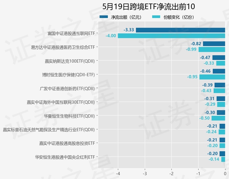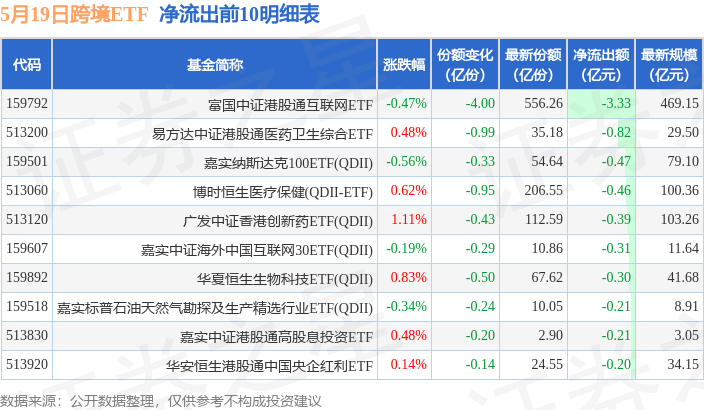 当日有32只跨境ETF基金出现资金净流出,其中净流出排首位的是富国中证港股通互联网ETF(159792),份额减少了4.0亿份,净流出额为3.33亿元。