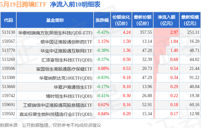 本站消息,5月19日跨境ETF基金合计资金净流入2.19亿元,近5个交易日累计净流出44.46亿元,5个交易日中出现日合计资金净流出的有4天(ETF资金流向计算公式:(当日ETF场内流通份额-前一交易日ETF场内流通份额)*当日ETF均价,计算结果仅供参考)。