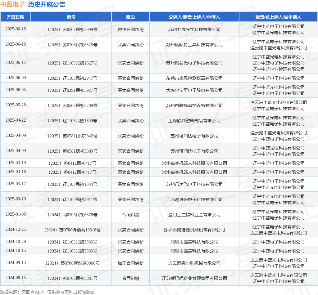 案号:(2025)苏0505民初5709号审理法院:苏州市虎丘区人民法院案由:买卖合同纠纷当事人信息: 原告/上诉人:苏州市联捷真空设备有限公司 被告/被上诉人:连云港中蓝光电科技有限公司、辽宁中蓝电子科技有限公司开庭日期:2025年5月28日根据统计,近一年内以辽宁中蓝电子科技有限公司为当事人的历史开庭公告有19则,其中案由为“买卖合同纠纷”的公告以15则居首,其次为“合同纠纷”有2则,“加工合同纠纷”有1则。历史开庭公告如下: