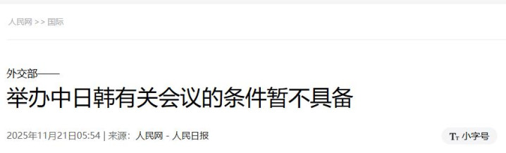 现在最尴尬的是原本计划在日本举办的中日韩领导人会议。作为轮值主席国,日本原想借此搞一场外交秀,但中方连2026年的意向征询都直接拒绝,“不具备条件”这五个字,已经把空间锁死。